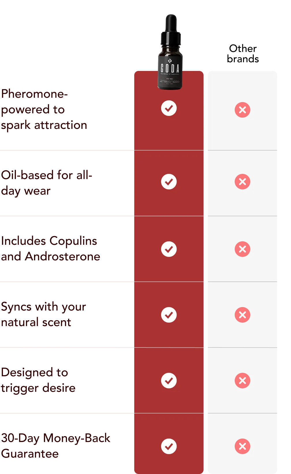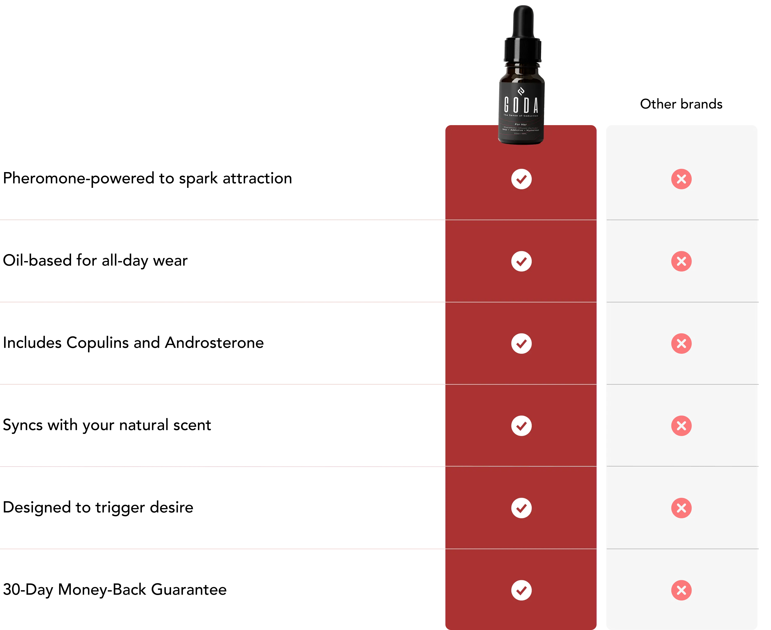 Our fragrances enhances your natural scent, but better. The mixture of Goda’s floral scented pheromones and copulin sends signals to the brain which enhances one’s attractiveness.